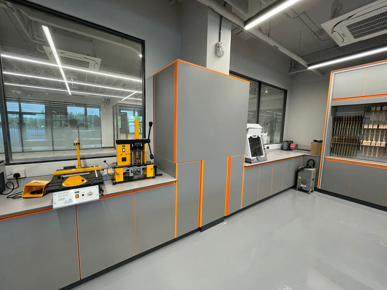 Brookhouse delivered a complete consultancy and design solution that combined robust construction, curriculum-led planning and carefully designed tool and storage systems. The design started with a new, flexible layout, allowing the space to quickly change between demonstrations, theory, CAD work and practical making, with safe circulation and clear sightlines. Custom workbenches, powder-coated in Wellington College’s colours, were paired with SGL worktops, HPL/MDF cabinetry and reinforced hardware to ensure long-term durability beyond standard classroom furniture. Storage was fully integrated into the benches to solve long-standing organisational issues, and a handleless design offered a clean, modern look.