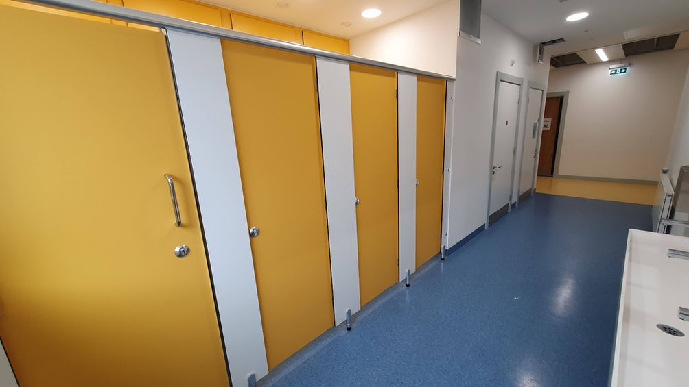 We introduced vibrant, colourful laminates throughout the school, enhancing the learning environment. The project also featured solid-grade laminate washroom cubicles, a bespoke reception hatch, wash troughs, and storage walls.
